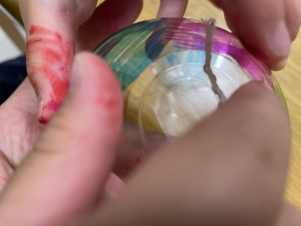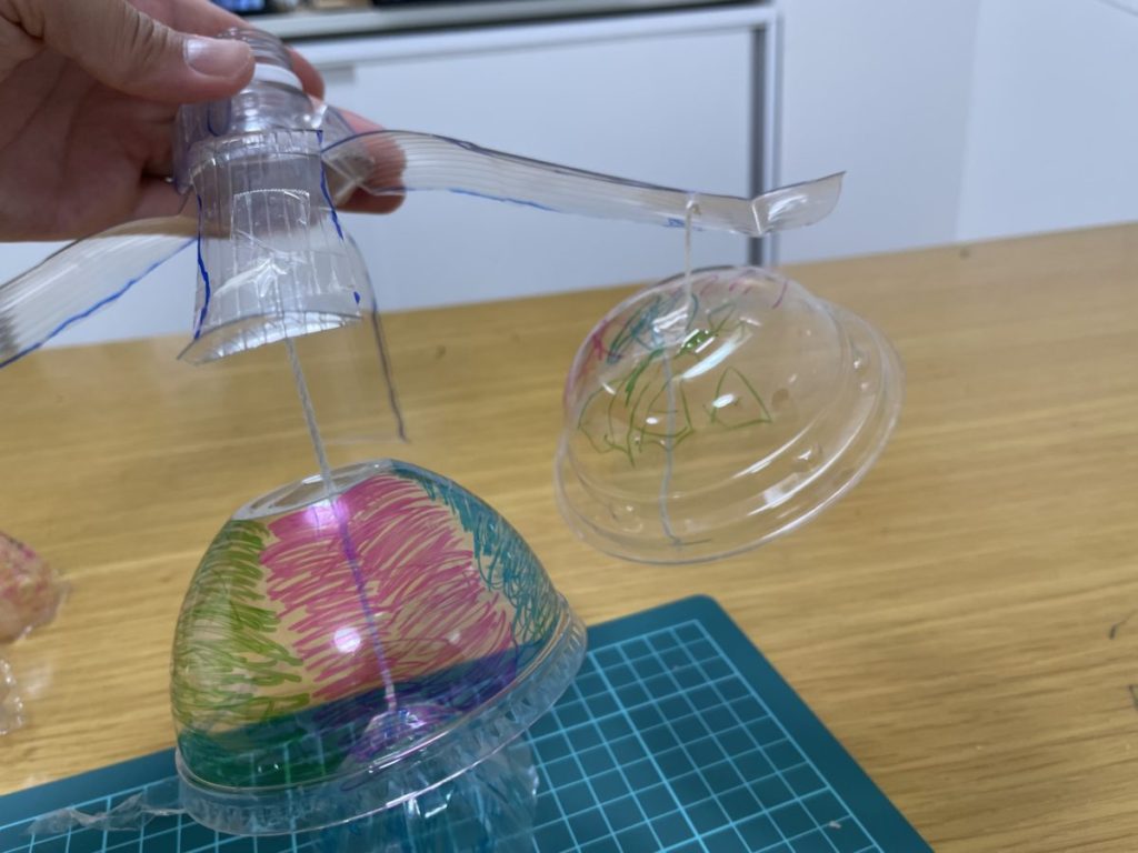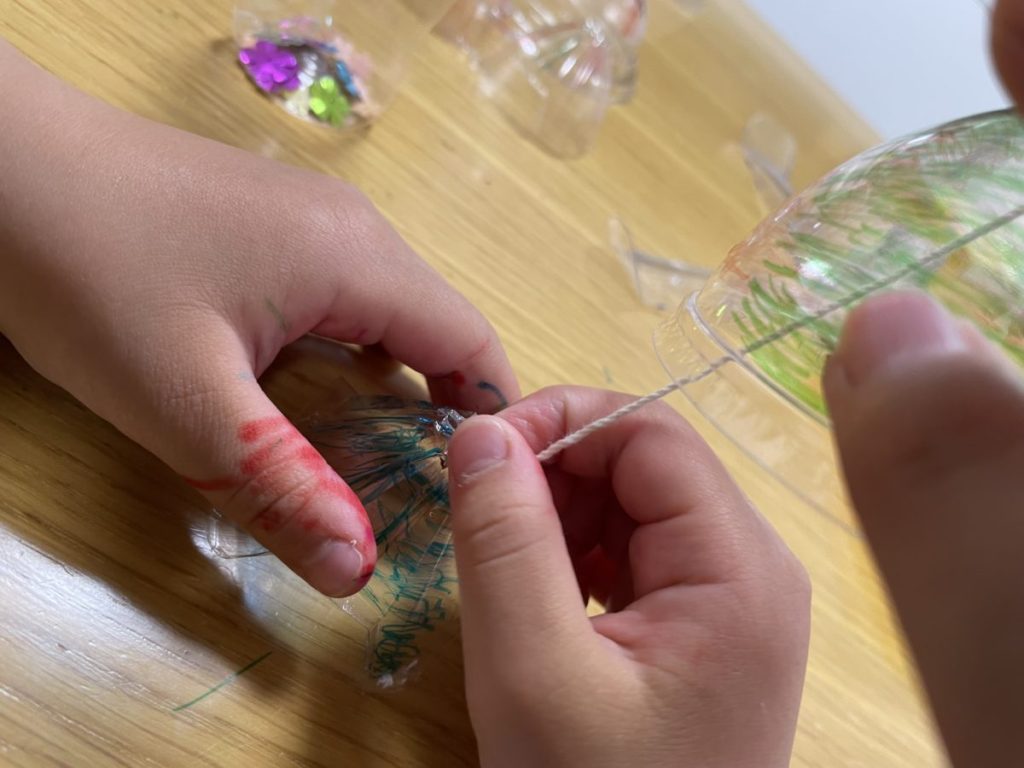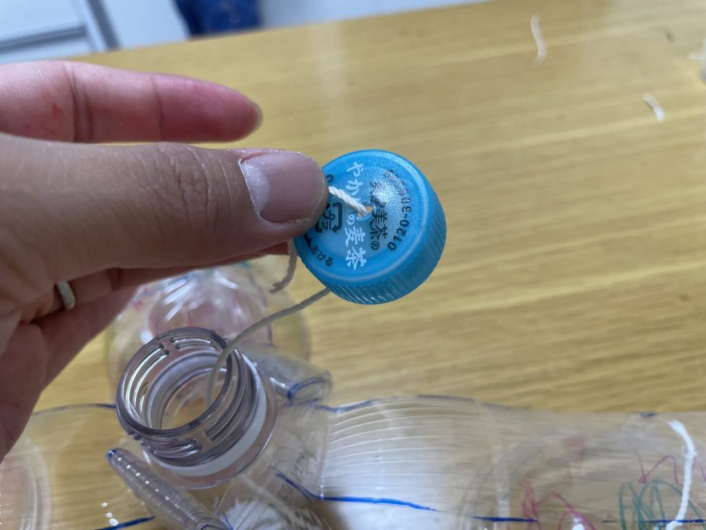 手順⑩ ペットボトルの蓋に穴をあけ、糸を通して吊るす場所を作ります。