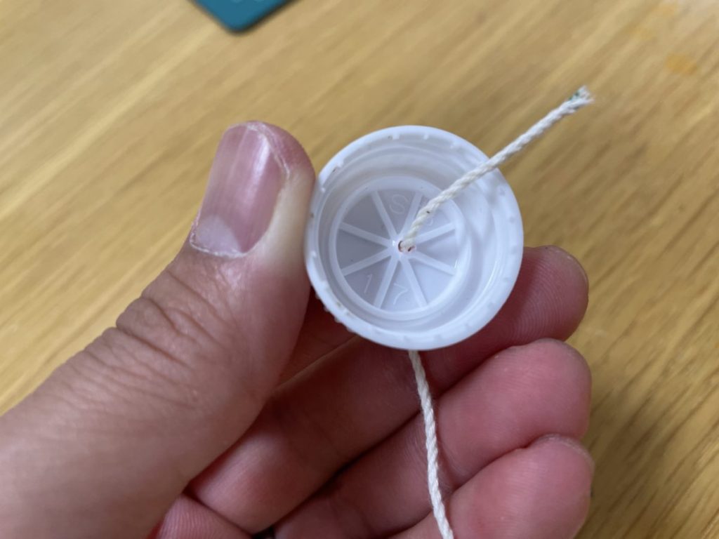 こちらのキャップに穴をあけて糸を通します。